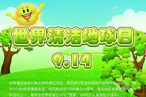 世界清潔地球日又名世界清潔日,英文為Clean Up the World Weekend (CUW Weekend),是全球性清潔活動(dòng),是由澳大利亞的國際環(huán)保組織Clean Up the World的伊恩基南發(fā)起,時(shí)間是定在9月的第三個(gè)周末,現(xiàn)為全球非常重要的環(huán)境保護(hù)活動(dòng)之一,每年全世界有超過125個(gè)國家、4000萬人參加這個(gè)活動(dòng)。2006年的世界清潔日活動(dòng)時(shí)間為9月15日至17日3天。也有參與組織和個(gè)人把每年的9月14日作為活動(dòng)時(shí)間。