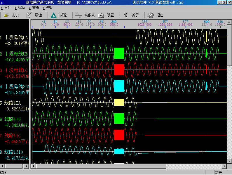 試驗前首先打開某一個記錄文件。記錄文件可以放在任何子目錄中,在“打開文件”對話框中查找,找到所在子目錄后程序會自動將所有后綴為.CFG的文件名列出。選定某一文件后程序自動將該名字的.CFG和.DAT文件調入,并將所有電壓電流波形及其通道名稱等顯示在屏幕上。另外還可以通過工具欄的按鈕查看文件屬性、波形離散采樣點等。
