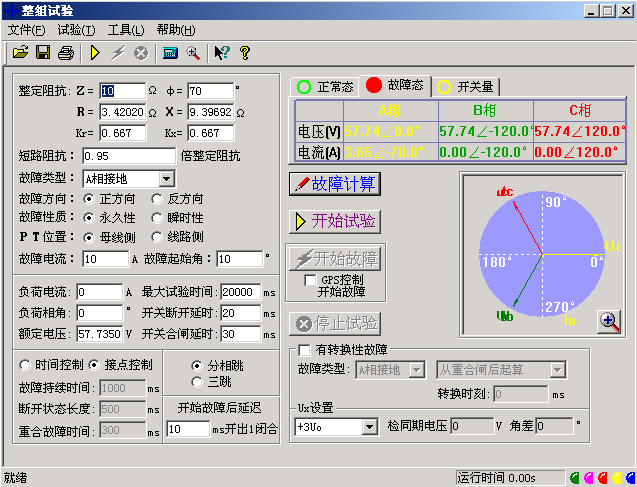 微機繼電保護測試儀整組試驗相當于繼電保護裝置的靜模試驗,通過設置各試驗參數,模擬各種瞬時、永久性的單相接地、相間短路或轉換性故障,以達到對距離、零序保護裝置以及重合閘的動作進行整組試驗或定值校驗。下面以“整組試驗Ⅰ”為例,簡要說明其使用方法。軟件界面如圖。