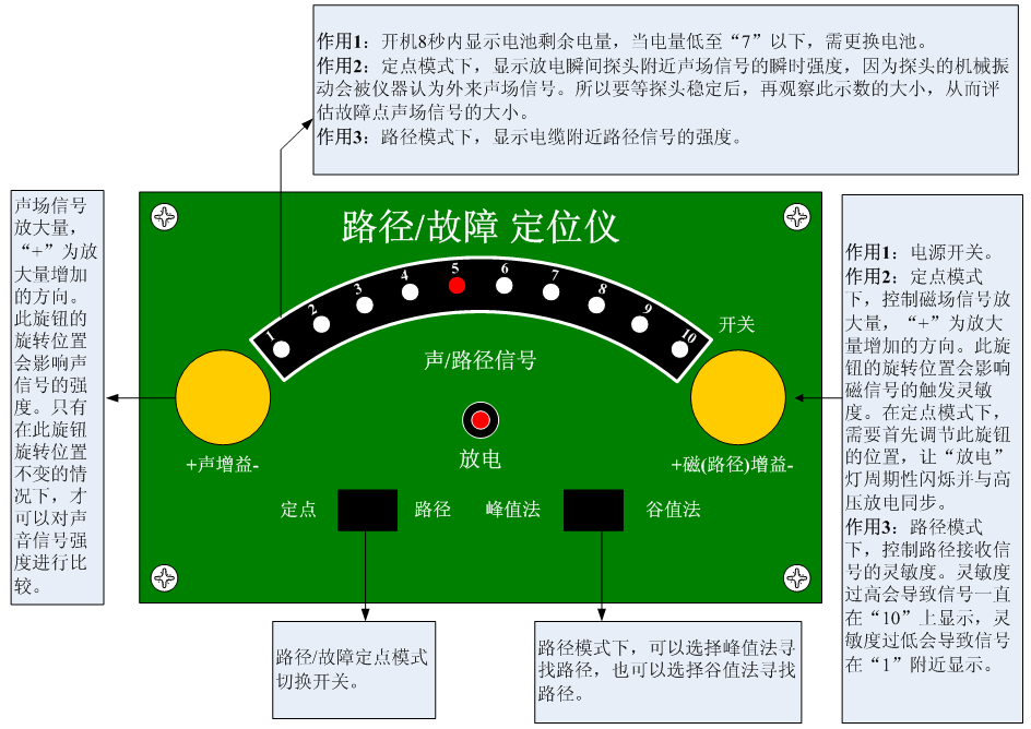 步驟2 將“定點(diǎn)/路徑”模式開(kāi)關(guān)切換到“路徑”模式然后打開(kāi)路徑/故障定位儀的電源開(kāi)關(guān),開(kāi)機(jī)8秒內(nèi)顯示電池電量(電量低于“7”時(shí)需更換電池?。?/span>