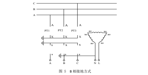 這種接線方式分“N 接地”、“B 相接地”兩種,分別如圖 4 和圖 5 所示。對于這兩種方式,均從 N-L 兩端注入測試信號。根據所用 PT 的不同,組成開口三角的二次繞組。